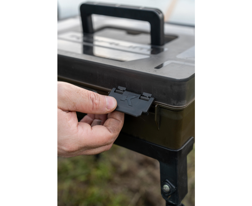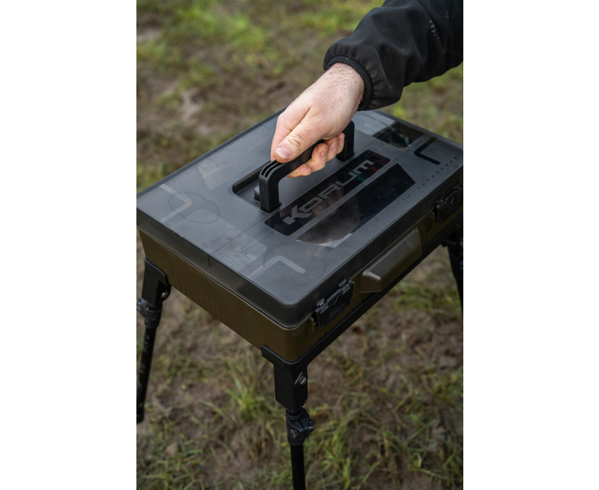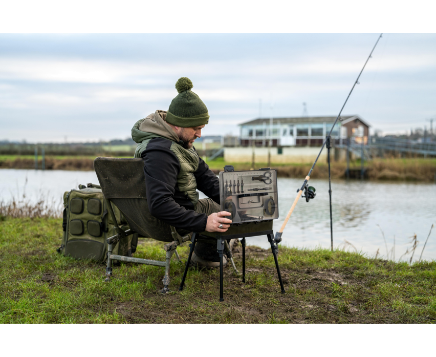 A freestanding total tackle station! Your perfect bankside companion, keeping all your terminal tackle, tools and rigs in one super solid tackle box unit. We've carefully sized BLOX to house must-have items of end tackle, like spools of line, packets of hooks and accessories. Your Baiting Tools, Disgorger and Scissors all click into place neatly, whilst the main box can be adjusted with dividers to suit your needs. The lid also houses two shallow RIG BLOX inside, keeping all your pre-tied hooklengths safe from the elements. Comes with telescopic legs, enabling you to have the unit in reachable distance when fishing from a chair, or keeping you super organised when fishing from a shelter. Comes with a durable, captive carry handle, side grab handle, secure clips and gasket. Also including is a length measurement for tying rigs. Box size W36 D26 H11.5cm. Legs: H33-55cm. Includes: