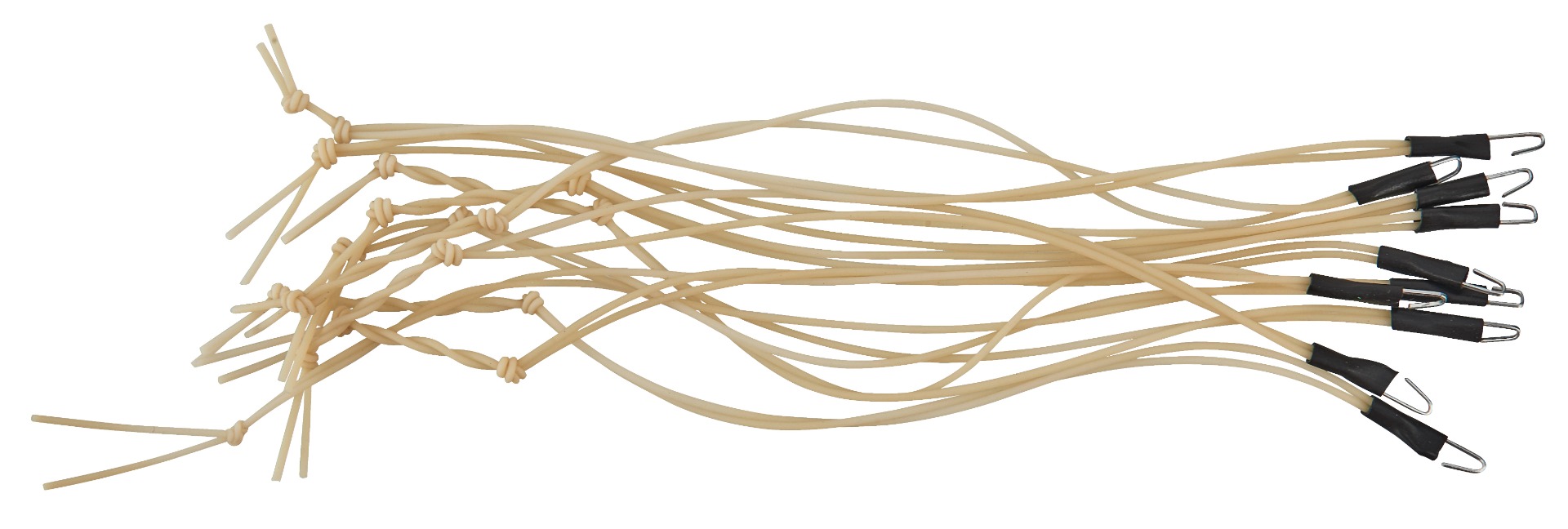 Haakjes bevestigd aan een sterke, soepele elastiek. De kleinste modellen zijn zeer praktisch voor het bevestigen van opgetuigde lijnen op kleine tuigenrekjes.